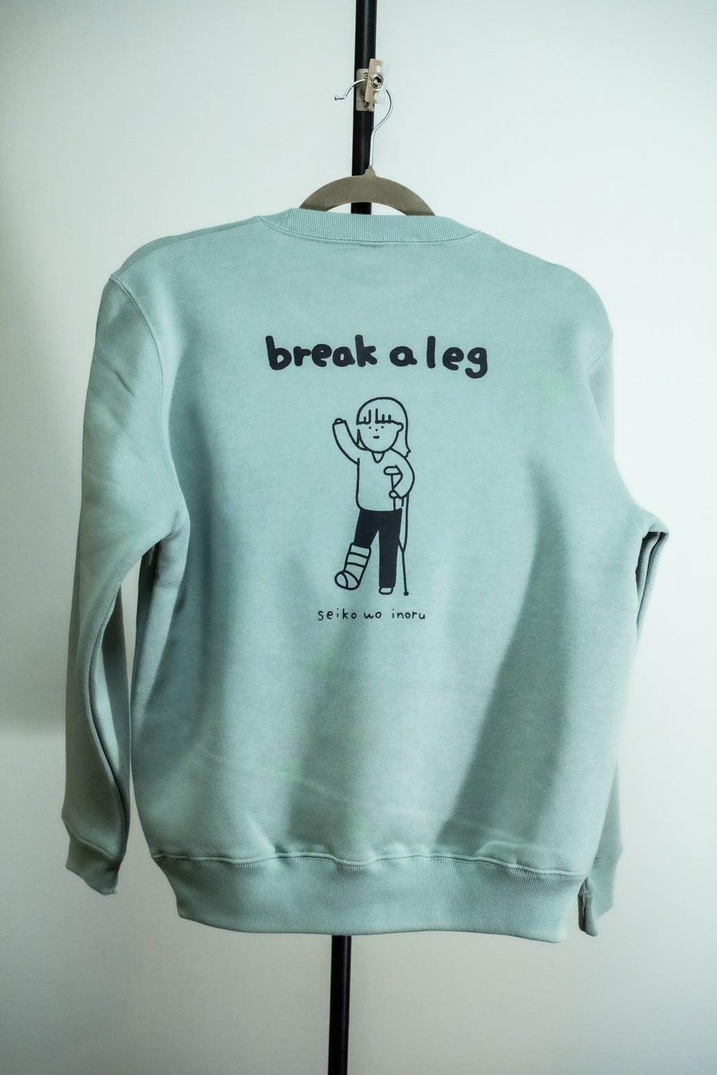 break a legはイラストの通り、直訳すると、「骨折する」ですが、実際にはこれからステージに出る人や、オーディションを受ける人などに対して「幸運を祈る、頑張って」という応援フレーズとして使われています!
