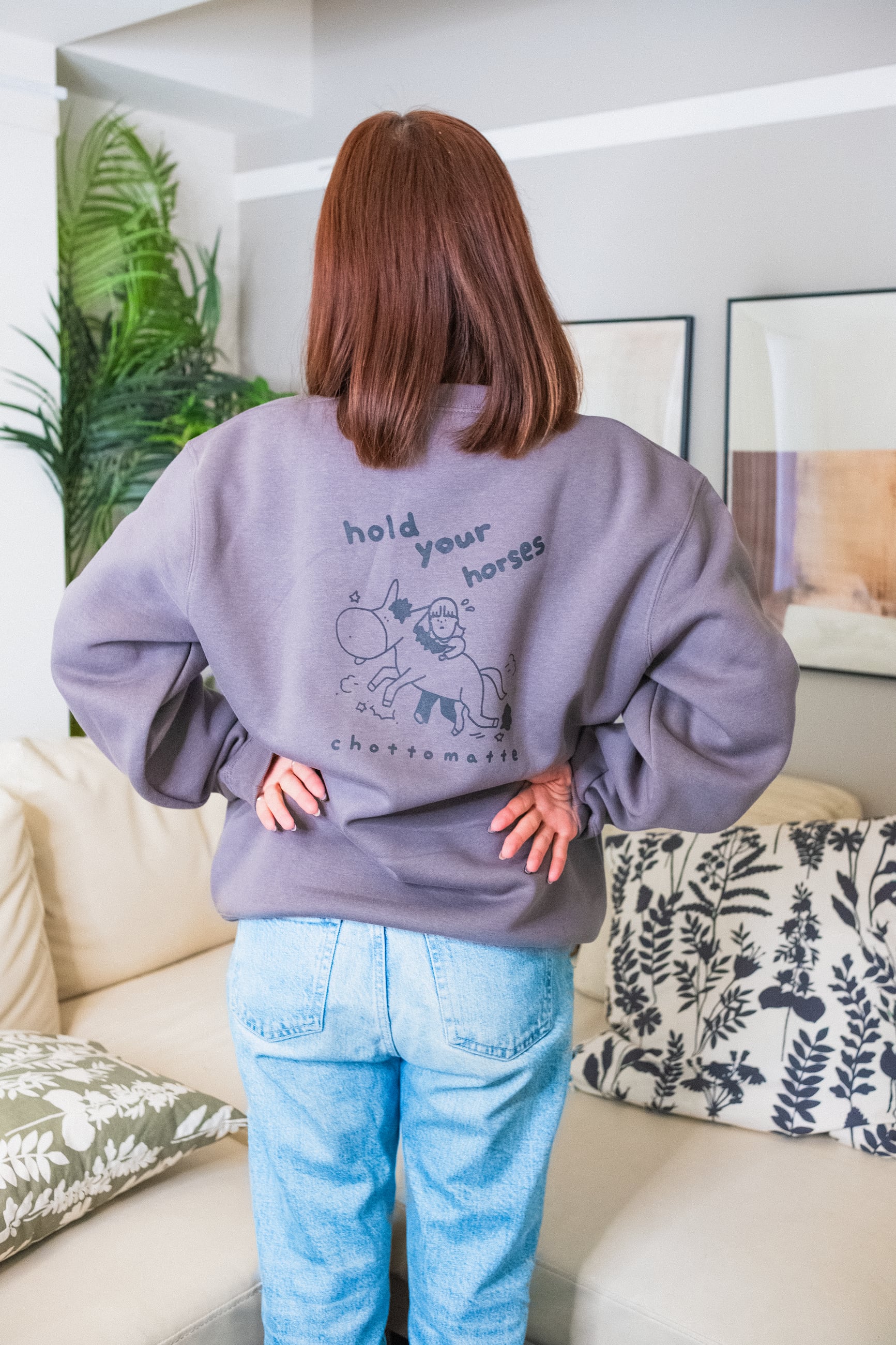 バックにフレーズ「hold your horses」が書かれています。